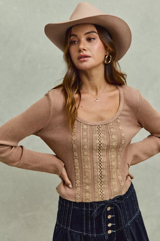 Angel Vintage Washed Lace Crop Thermal Washed Knit Top