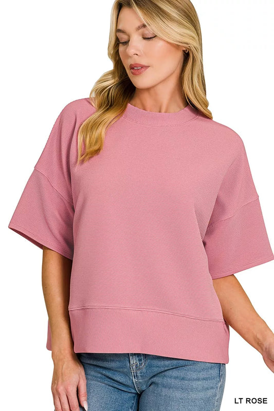 Like A Feather Ribbed Round Neck Waist Banded T-Shirt