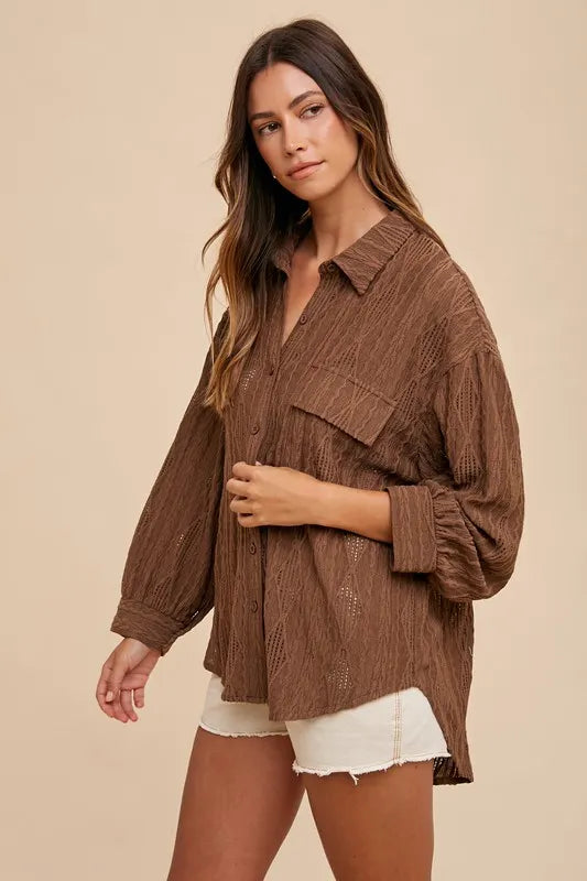 Openwork Button Down Drop Shoulder Shirt