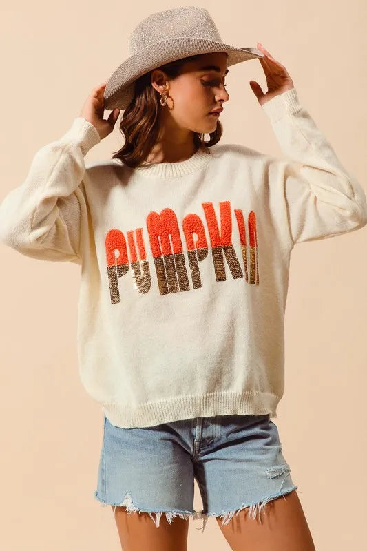 Spice Contrast Sequin Pumpkin Slogan Sweater Top