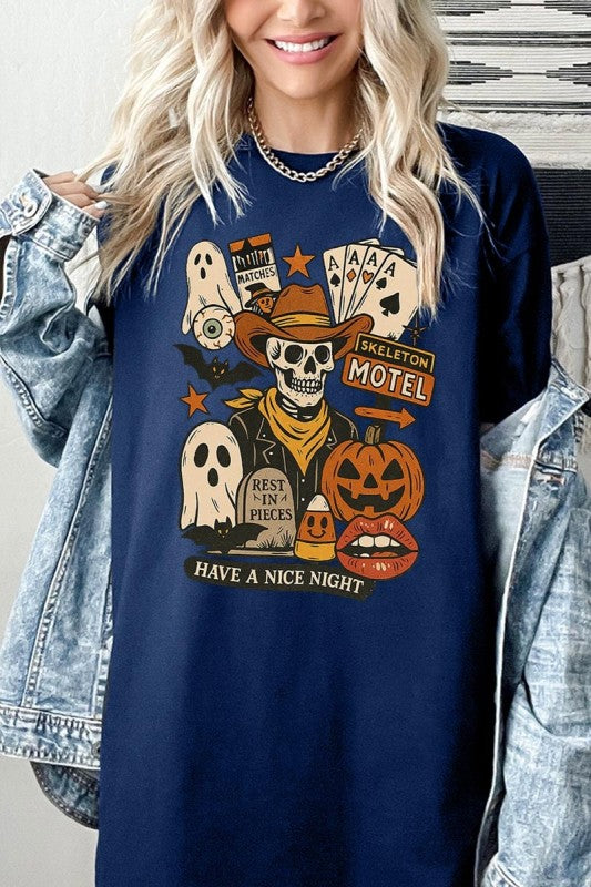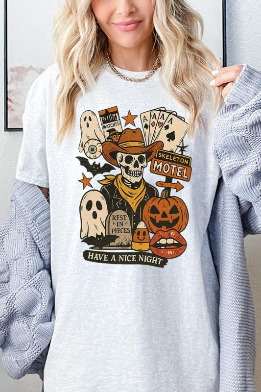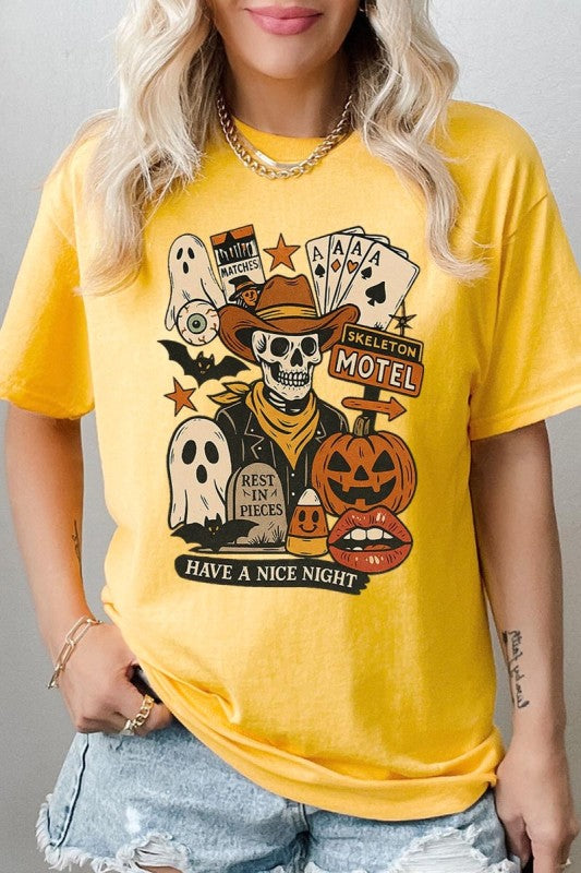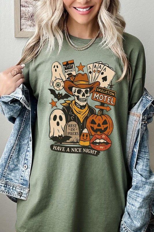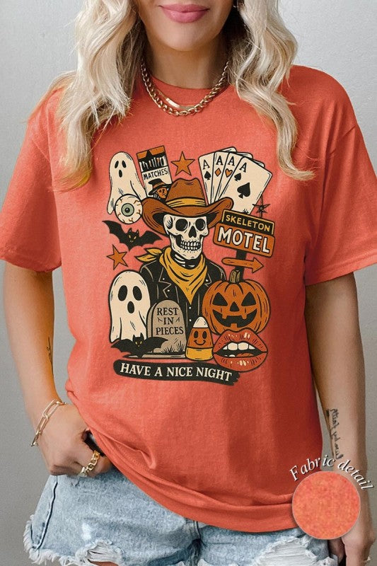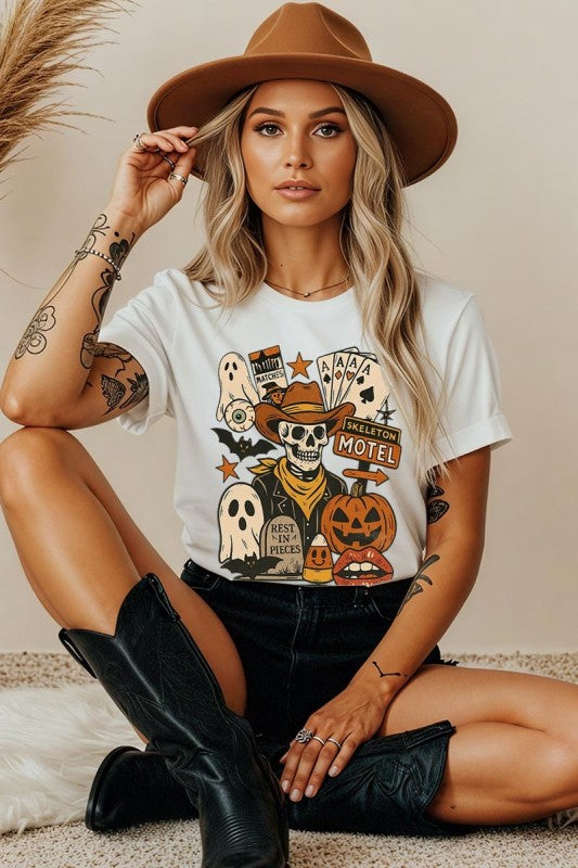 Spooky Western Skeleton Collage, Halloween Cowboy, Pumpkin Ghost, Vintage Motel Graphic Heavy Cotton Tee.